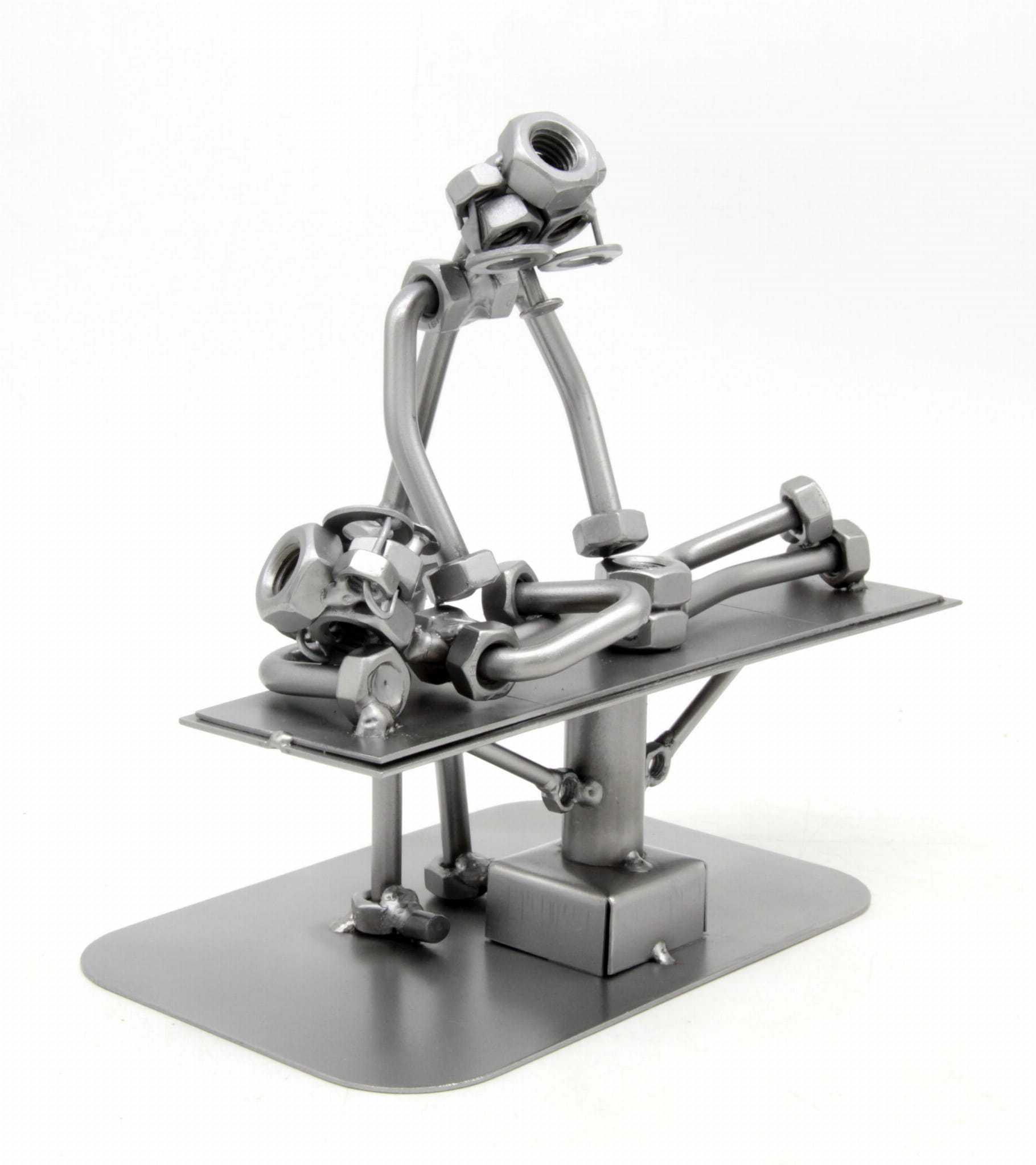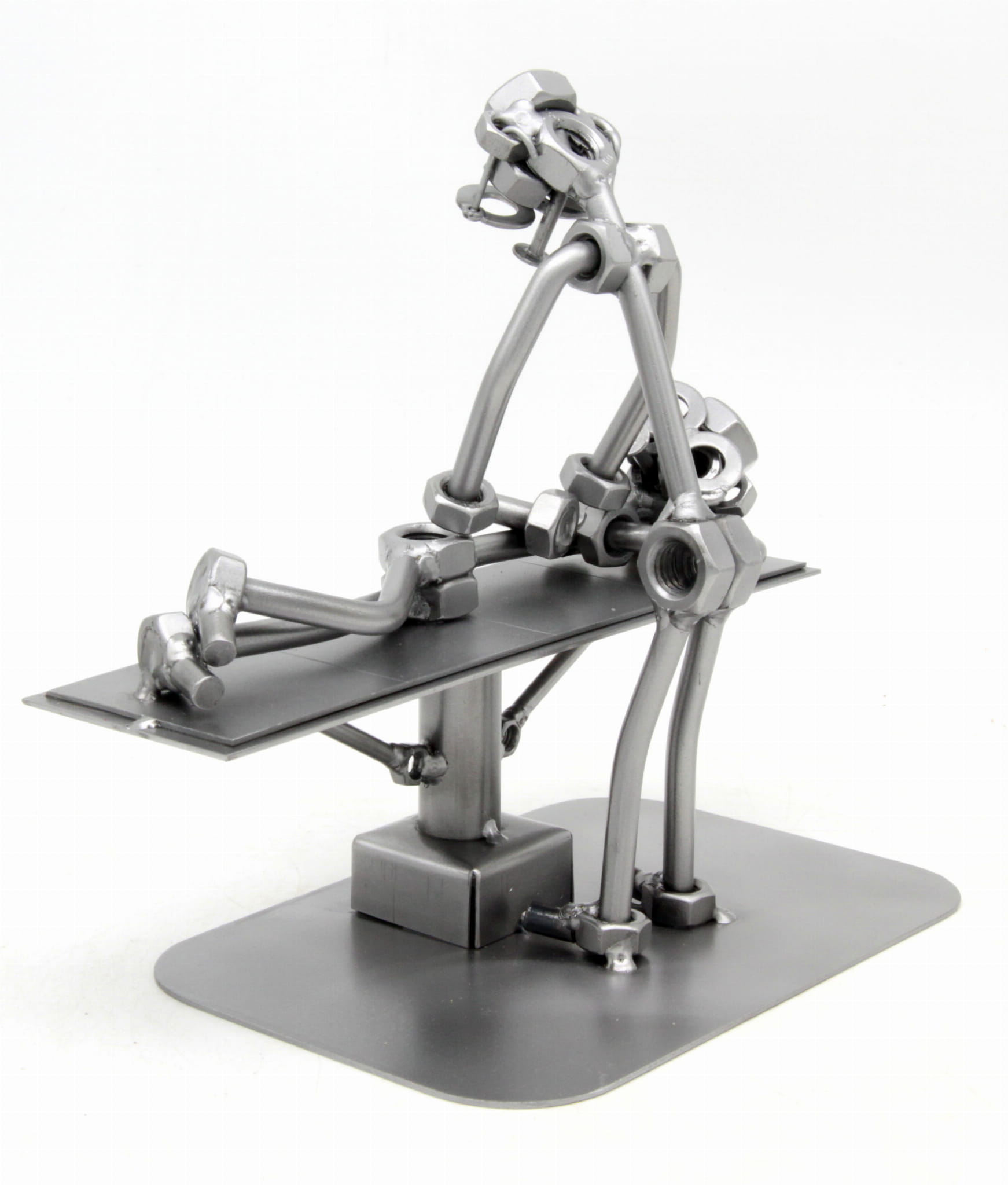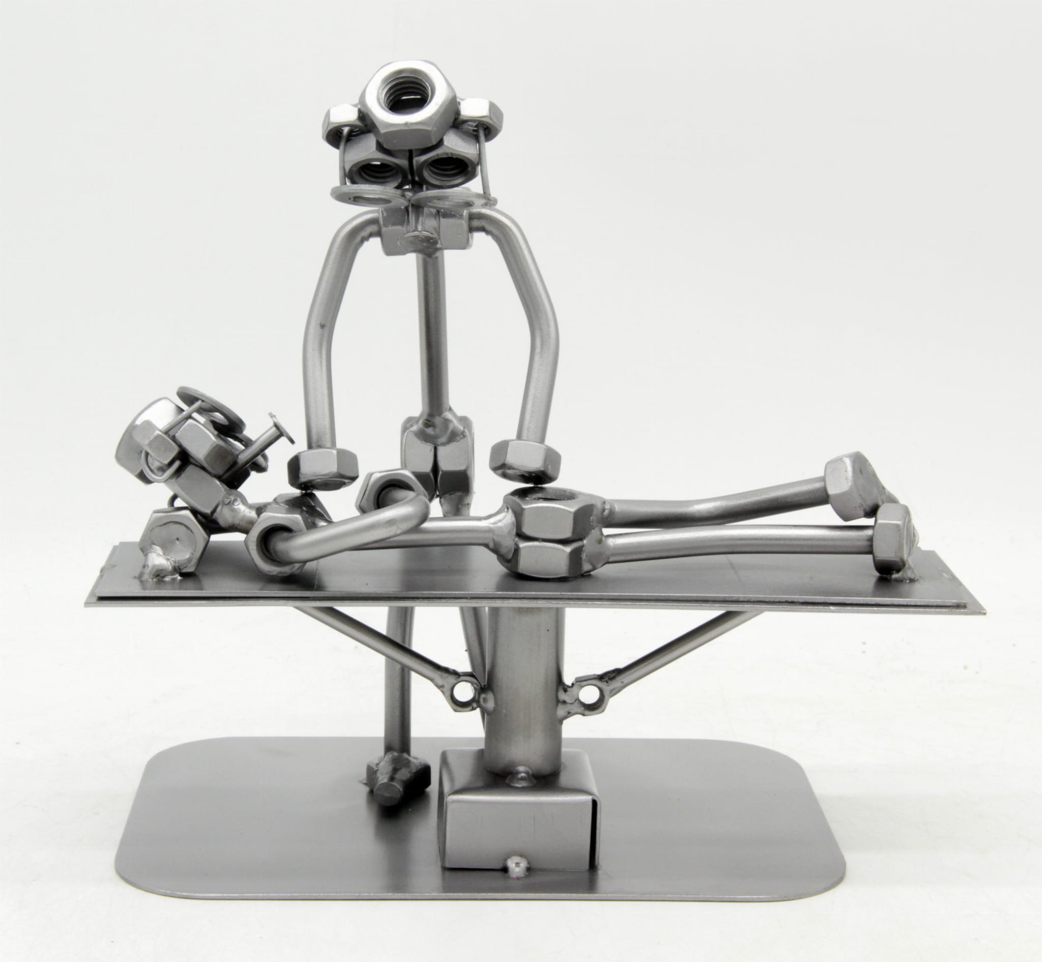 Wyjątkowa figurka wykonana z metalu, przedstawiająca fizjoterapeutę podczas zabiegu rehabilitacyjnego.