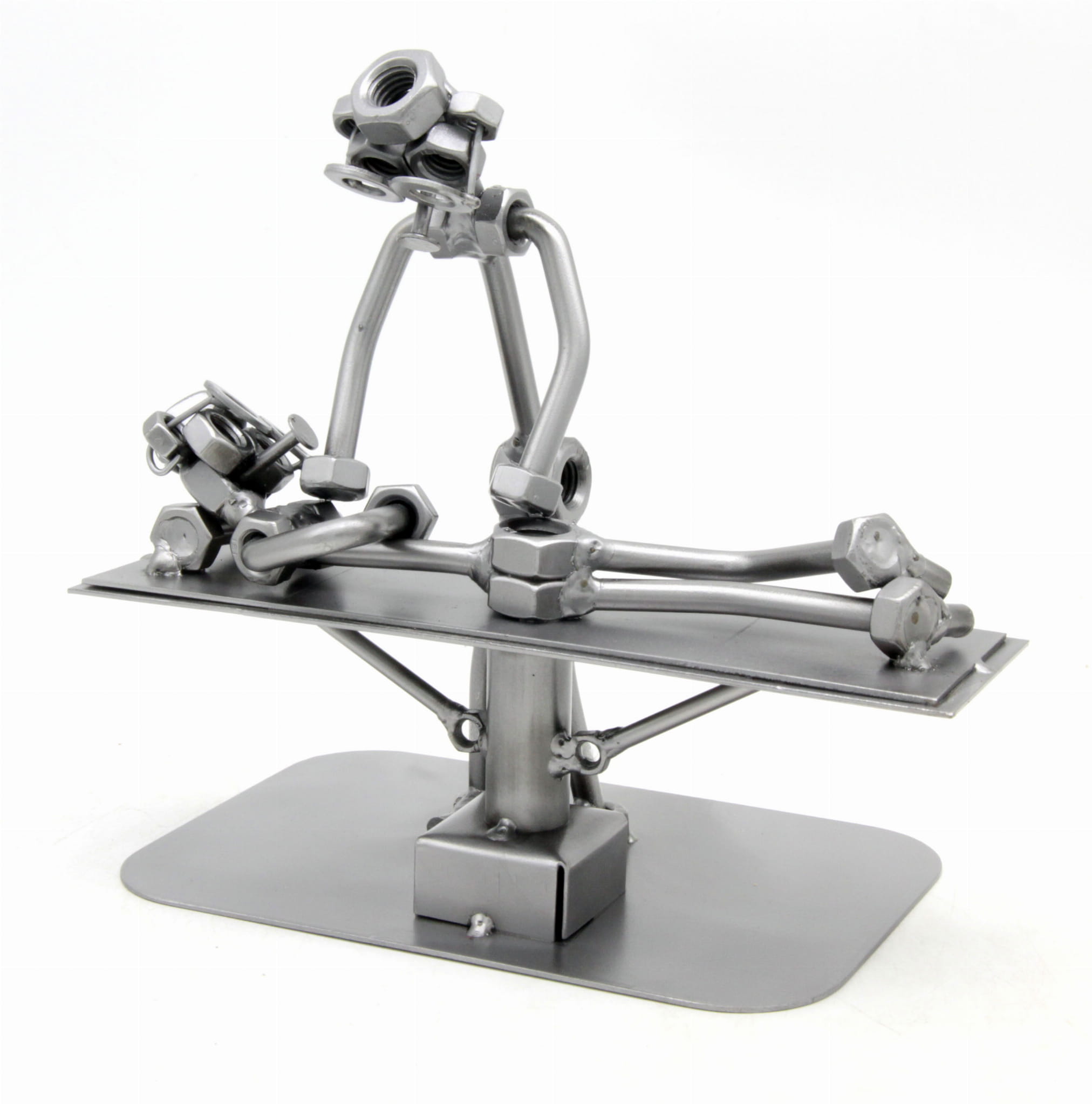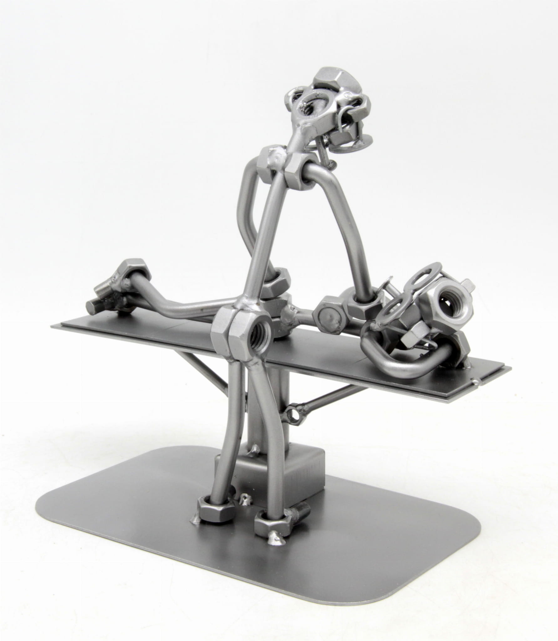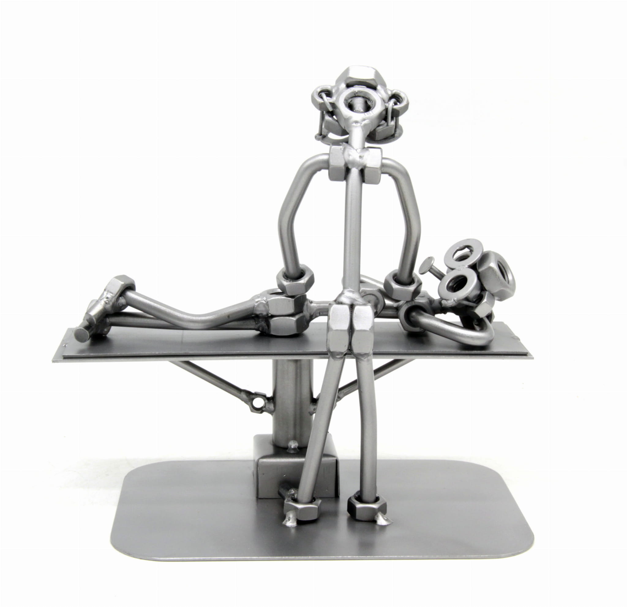 Wyjątkowa figurka wykonana z metalu, przedstawiająca fizjoterapeutę podczas zabiegu rehabilitacyjnego.